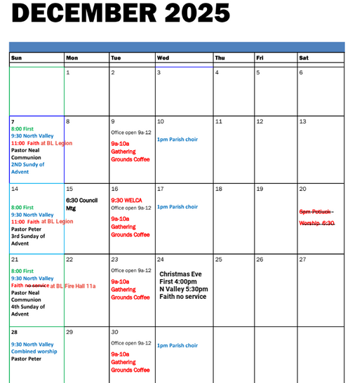 Faith = Faith Lutheran (RED) NV = North Valley (BLUE) First = First Lutheran (GREEN)